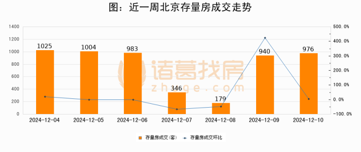 从存量房来看,2024年12月10日北京存量房单日成交976套,比昨日增加36套,环比上涨3.8%。从近一周存量房成交来看,北京存量房日均成交套数为779套,12月10日单日成交976套,高于近一周平均水平25.3%。