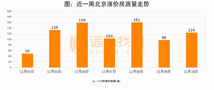 根据诸葛找房数据显示,北京24小时涨价房源量为124套,较12月09日增加26套,环比上涨26.5%。与此同时,涨价房源占比小幅扩大,业主信心有所提升。