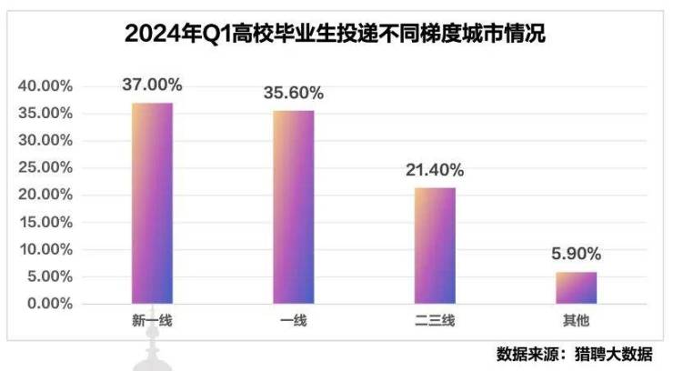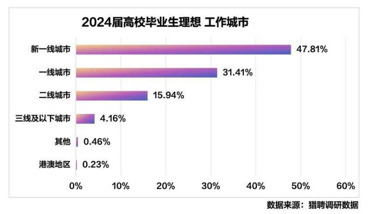 根据猎聘调研数据,47.81%的2024届毕业生,选择新一线城市为理想工作城市,排名第一;而想来一线城市的仅占31.41%。