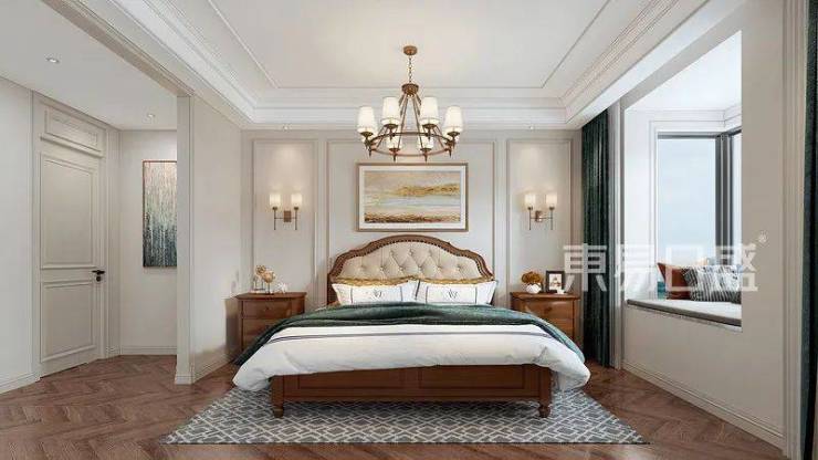 整体乳白色的墙面与地面形成明暗对比,鱼骨深色的木地板是美式复古风的一大特征,与美式大床、床头灯形成呼应,木质的家具表现出高级的质感,且有种轻松舒适的氛围感,金属的吊灯设计,给整体的卧室空间增加了品质感。