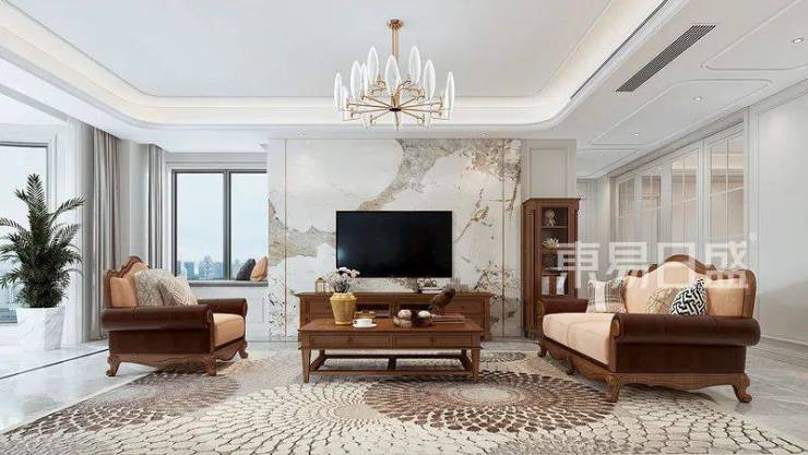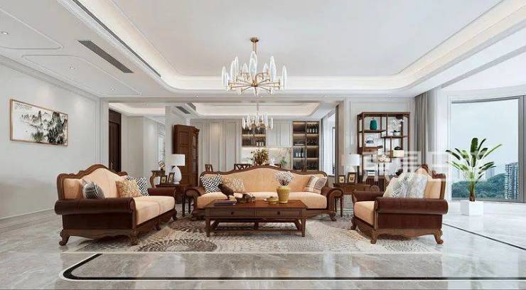 客厅原始的光线非常充足,双面的全开放式落地窗设计,结合美式复古的元素设计,复古而又精致的家具与空间相碰撞,突出了空间的焦点;