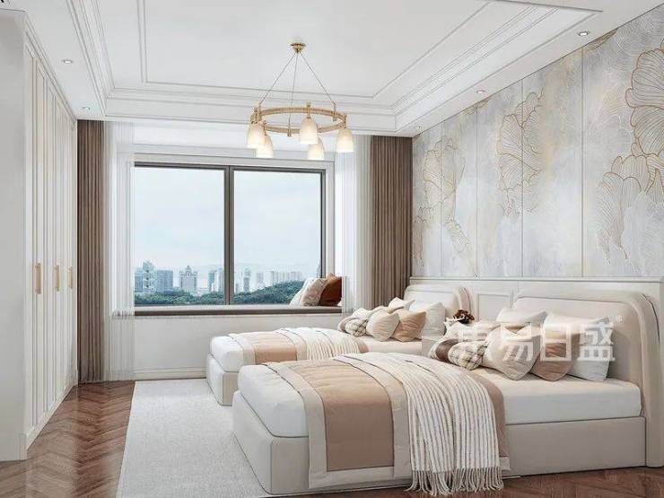 次卧的设计没有用过多传统美式的元素,而是将软装家具及装饰进行改良,延续了美式复古风的元素,更多的是以轻奢风为主做改良,金属、吊灯、皮包大床的结合,呈现出精致、舒适的居所。