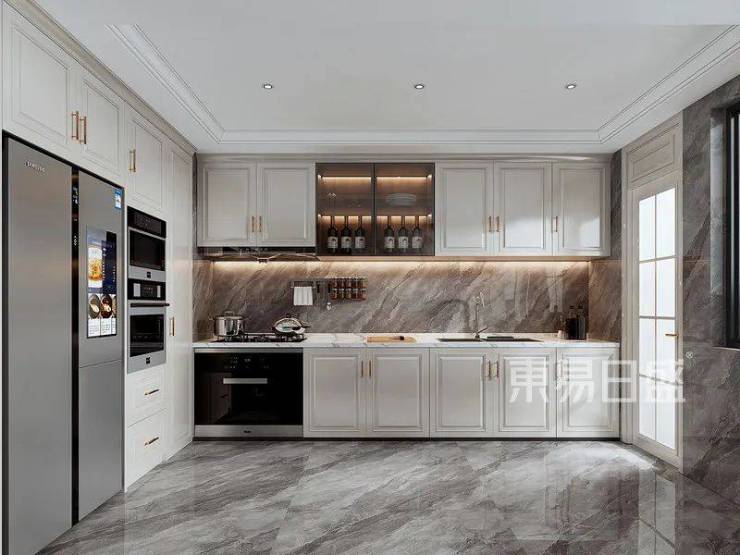 现代美式的厨房设计,整体在橱柜上用了矩形线条和金色把手进行搭配;同时又结合欧式独特的大纹理地砖进行呼应,整体的厨房设计搭配给人一种干净、轻奢、又透着欧式复古的大气感。