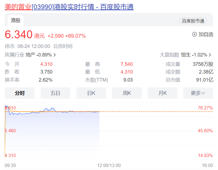 6月24日A股开盘,美的置业(HK03990,股价6.34港元,市值91.01亿港元)一路暴涨,一度涨超100%。截至午盘,美的置业涨幅有所回落,收窄至69.07%,股价为6.34港元。