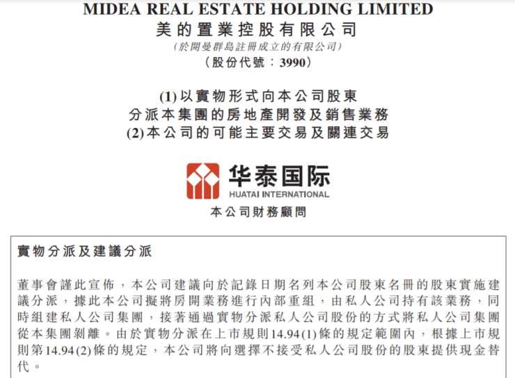 此次分派还提供了现金选择权,也即持有美的置业股票的股东如不参与房开业务股权的实物分派,可选择对等的现金分派。每股现金分派金额5.9港元,相比公告前一日收盘价溢价57.33%。