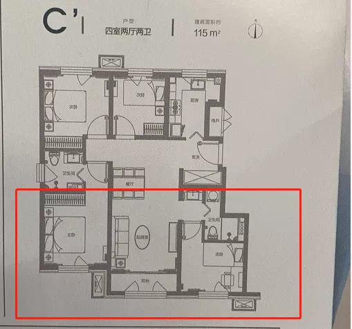115平四居依旧很紧凑,三面宽,动线合理,不会相互打扰。可惜有墙壁遮挡,没办法实现纯粹的南北通透,阴天采光可能没有那么理想。