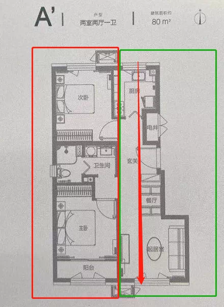 80平两居功能区分区很清晰,面宽进深比例也可以,最重要客厅厨房窗户实现南北通透。不过可惜南北卧室不能通透起来,不过卧室空间没有过度压缩,这点很赞,最后明厨明卫,罢错!