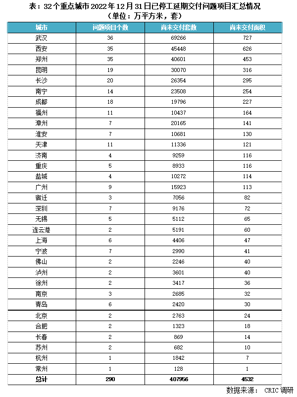 值得关注的是,32个典型城市停工项目所涉及的尚未交付总建面达到了4532万平方米,尚未交付总套数约40.80万套。