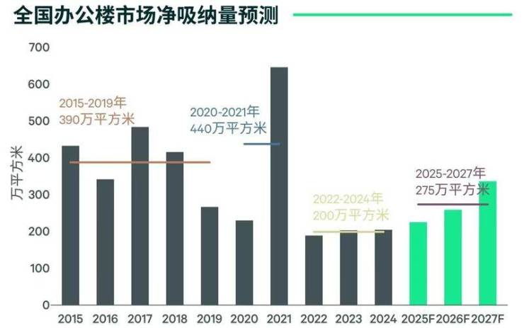报告显示,2025年全国主要一二线城市将迎来约640万平方米的新增供应,同比增长近七成,受此影响,年末全国办公楼市场平均空置率预计升至26.7%。尽管租金继续承压,但大部分城市跌幅有所收窄。