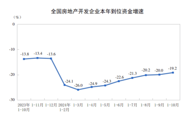 付凌晖认为,销售回暖、价格趋稳,带来房企资金流有所改善。前10个月,房地产开发企业本年到位资金同比降幅比1-9月份收窄0.8个百分点,与房地产销售关联较高的定金及预收款、个人按揭贷款均收窄2.1个百分点。