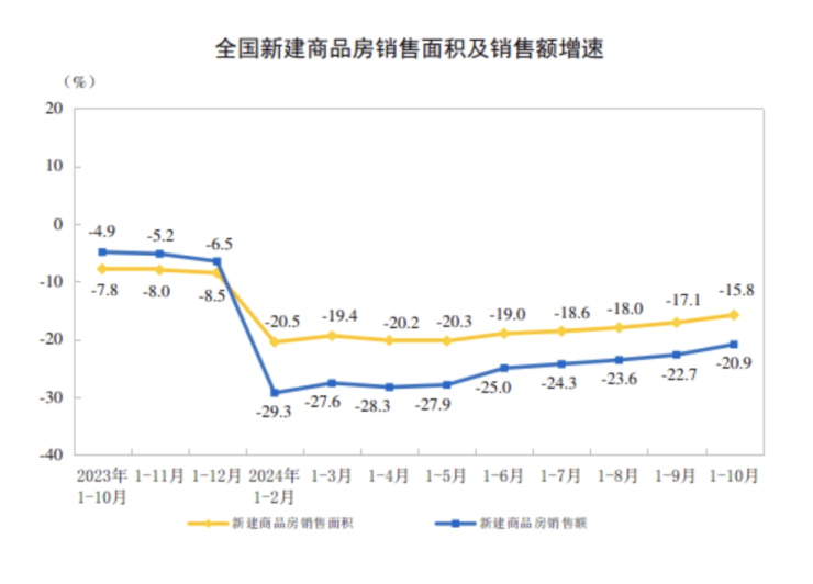 11月15日,国家统计局发布2024年1-10月份全国房地产市场基本情况。数据显示,1-10月,新建商品房销售额、销售面积累计同比降幅继续收窄,其中销售面积累计同比降幅已连续5个月收窄,销售额降幅连续6个月收窄。
