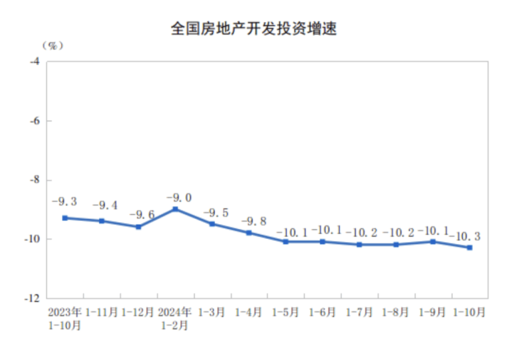 国家统计局数据显示,1-10月份,全国房地产开发投资86309亿元,同比下降10.3%(按可比口径计算);其中,住宅投资65644亿元,下降10.4%。