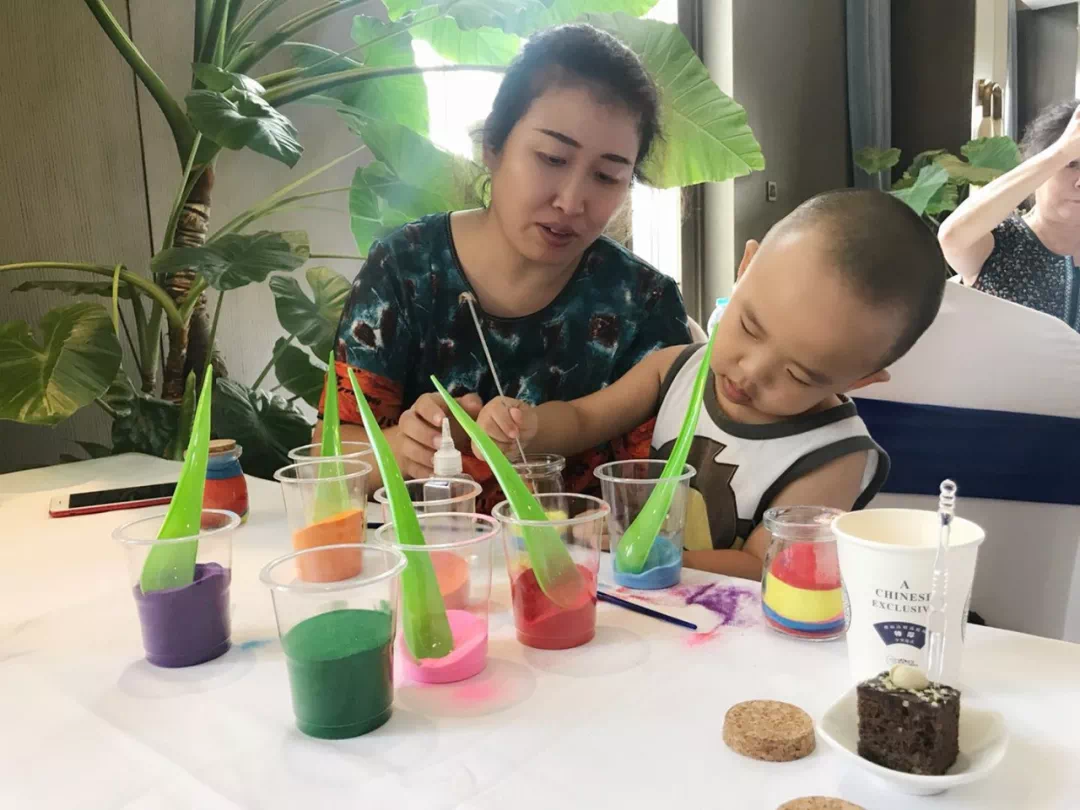 在自由活动环节,一个个家庭纷纷动手进行沙画瓶DIY,启发儿童动手天分。湖光春色、动物植被、卡通人物,一个个鲜活的形象跃然瓶上。在一捧捧彩沙中,在一片欢声笑语中,一起感受着浓郁夏日风情里温馨的亲子时光。