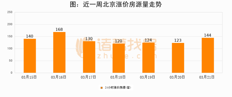 根据诸葛找房数据显示,北京24小时涨价房源量为144套,较03月20日增加21套,环比上涨17.1%。与此同时,涨价房源占比小幅扩大,业主信心有所提升。