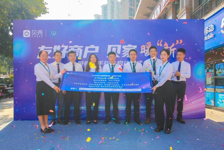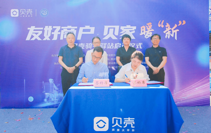 当日,在重庆市委社会工作部、重庆市住房和城乡建设委员会、重庆市市场监督管理局、共青团重庆市委等多部门的指导与协助下,“友好商户•贝家暖新”贝壳骑手驿站启动仪式开展,标志着贝壳重庆站正式启动“贝壳骑手驿站”项目运营,120家合作新经纪品牌门店化身为服务新就业群体的“温暖站点”。