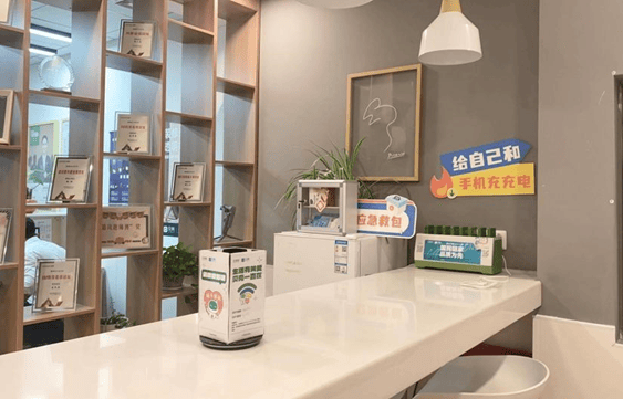 面积超200平方米的店内空间,不仅摆放着舒适的桌椅和沙发,还设有党建活动室。餐吧旁边放着充电器,还有一个应急药箱,里面备有风油精、纱布、创可贴、碘伏棉签等常用药品。门口的架子上,有可供免费外借的雨伞。这些贴心的设施打造,组成了贝壳骑手驿站的 “一站式”暖“新”服务的缩影。