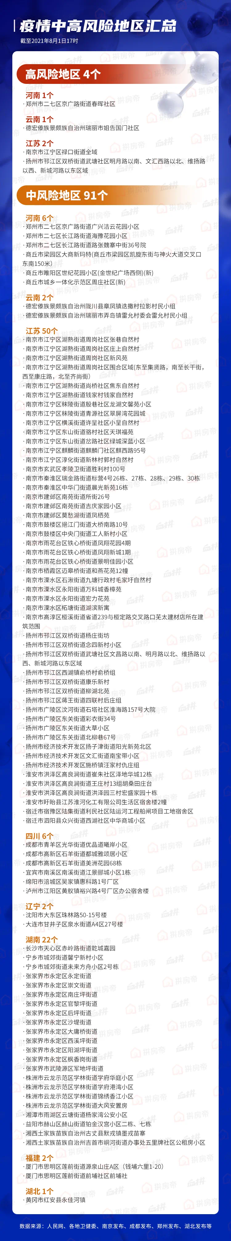 全国疫情分布地图截止8月1日,全国共有高风险4个,中风险91个,分别集中在江苏、湖南、河南和四川。