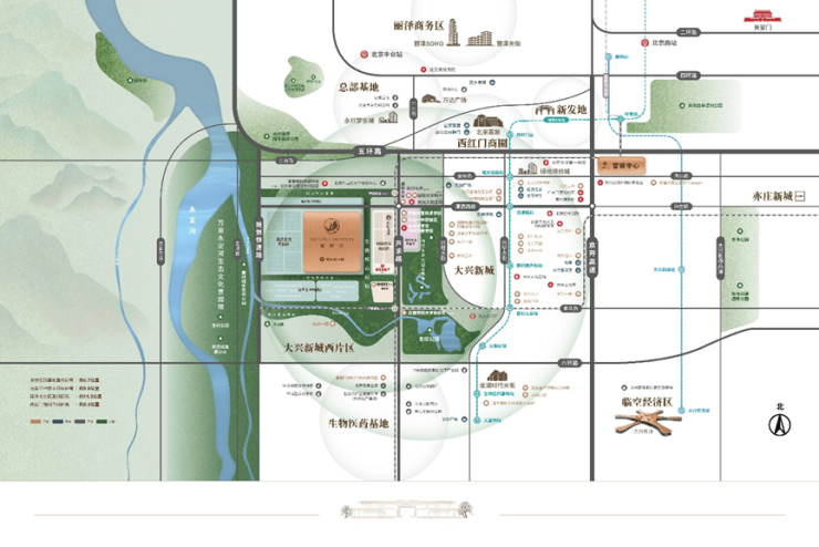 生态:西接永定河生态走廊,东观清源公园、永定公园、念坛公园,北瞰约5508亩城市森林公园