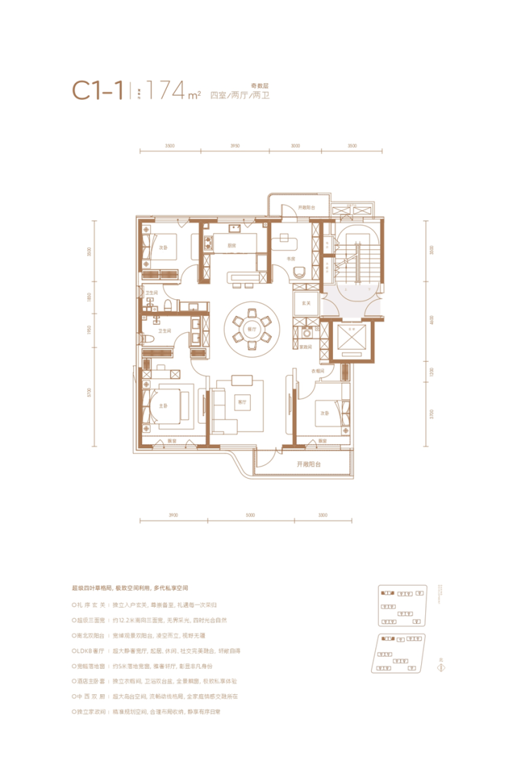 174㎡四居:168㎡四居升级款,U型中厨+独立岛台西厨,台面操作空间比168㎡户型多出2.3米;南向三面宽约12.2米,主卧套房+南向飘窗面宽3.9米,南向次卧连接开敞式阳台,独立玄关+家政间,北向书房连接北向阳台;