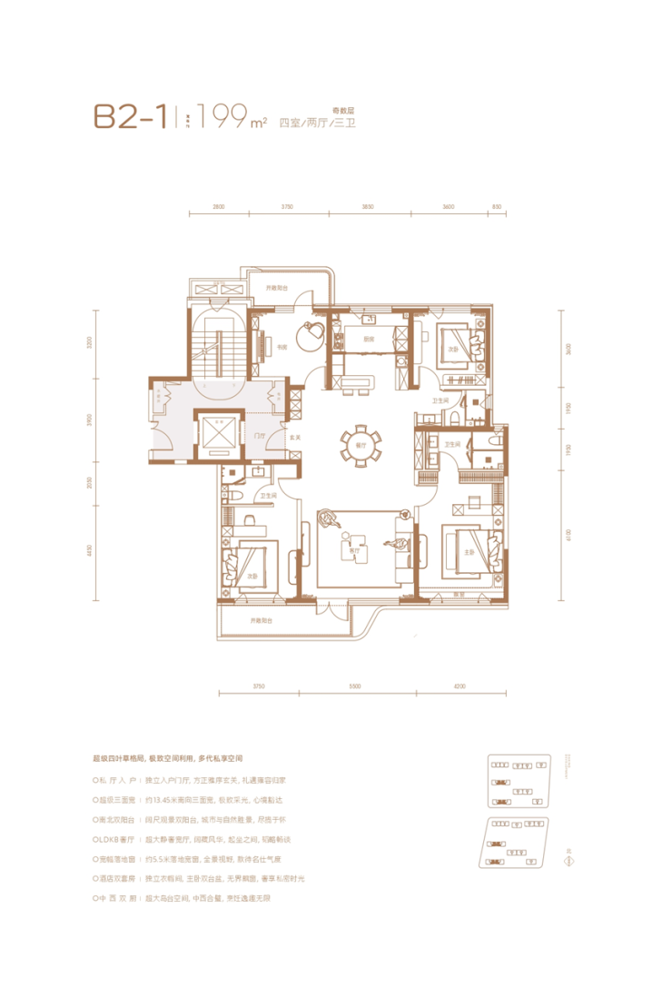 199㎡四居三卫:南向双套房设计带独立卫浴,客厅面宽5.5米+南向次卧连接南向阳台,U型中厨+独立岛台西厨,LDK一体化设计;
