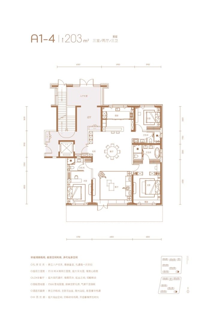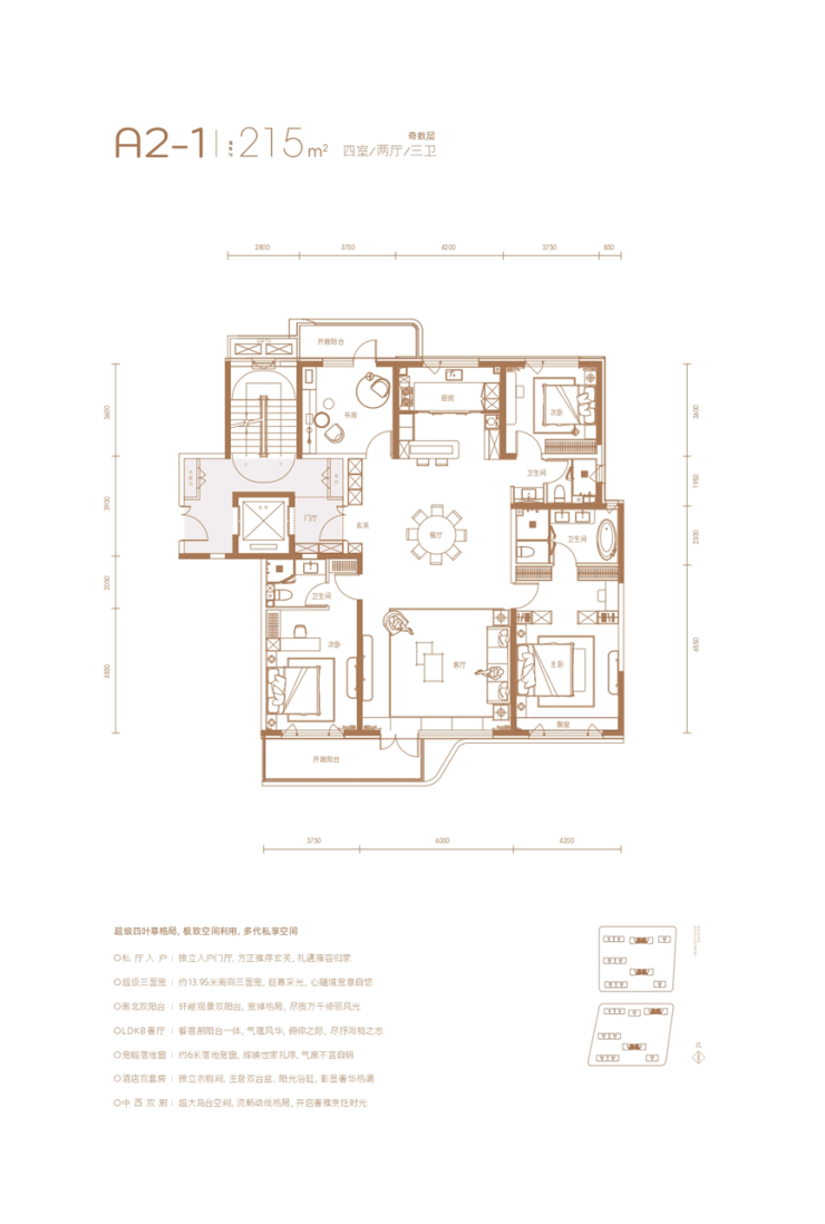 215㎡四居三卫:独立入户门厅+入户玄关,南向13.95米面宽,客厅面宽6米,南向双套房设计,U型厨房+中西厨全岛台;