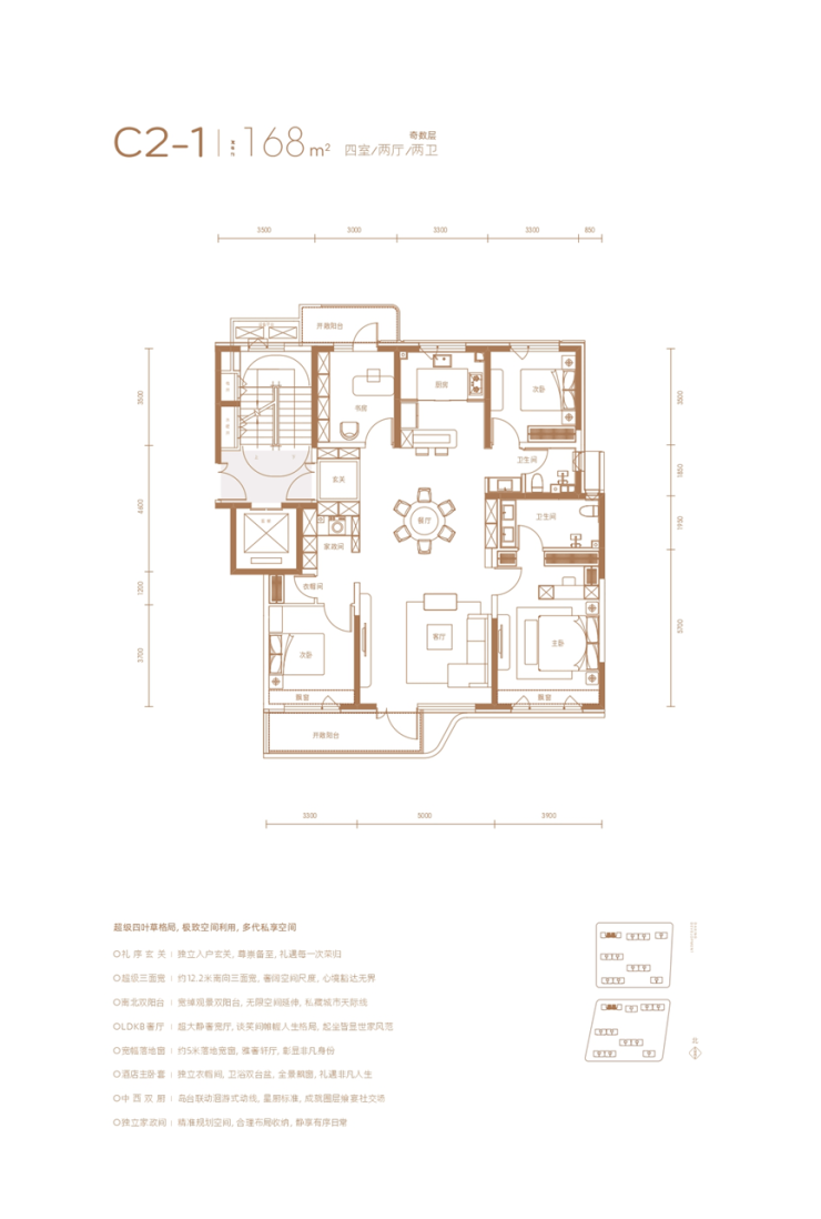 168㎡四居:四叶草格局,入户独立玄关,南向三面宽+5米宽厅,LDKB一体化形成约45㎡活动区,可同时容纳10人聚餐;主卧套房设计+独立衣帽间+独立双台盆卫浴,面积达25㎡;南向次卧连通景观阳台,北向次卧面积约10㎡连接北向阳台,U型厨房+岛台设计;