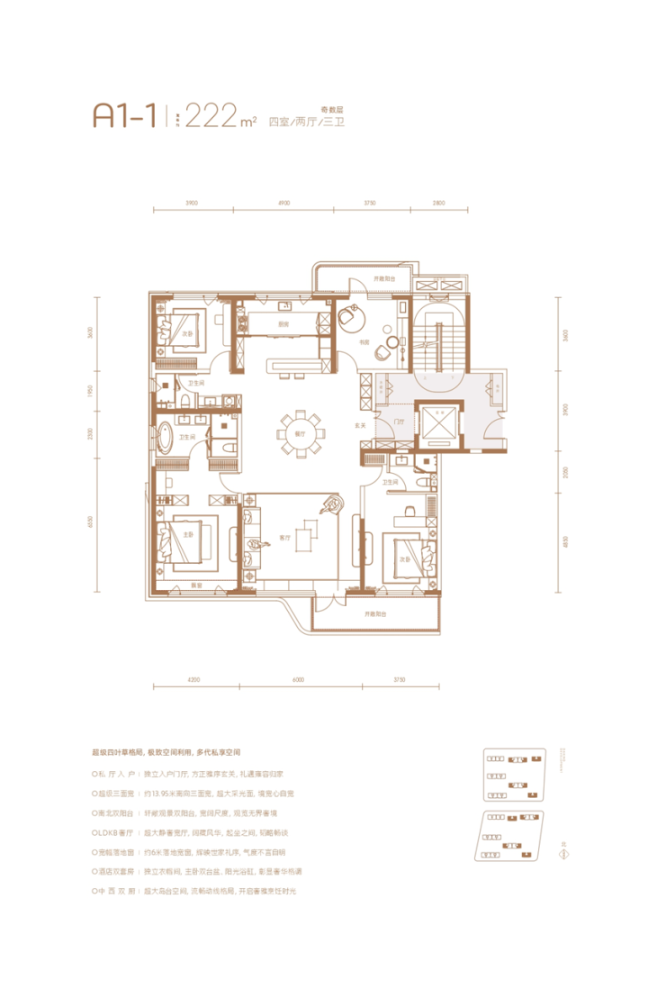 222㎡四居三卫:私厅入户+独立玄关+鞋帽间,归家动线与家政动线完全分离,南向酒店式双套房,主卧面积约42㎡+次卧面积约28㎡,均配备独立卫浴,满足双主卧需求,南向6米宽大落地窗,LDK一体化+U型厨房+中西厨全岛台;