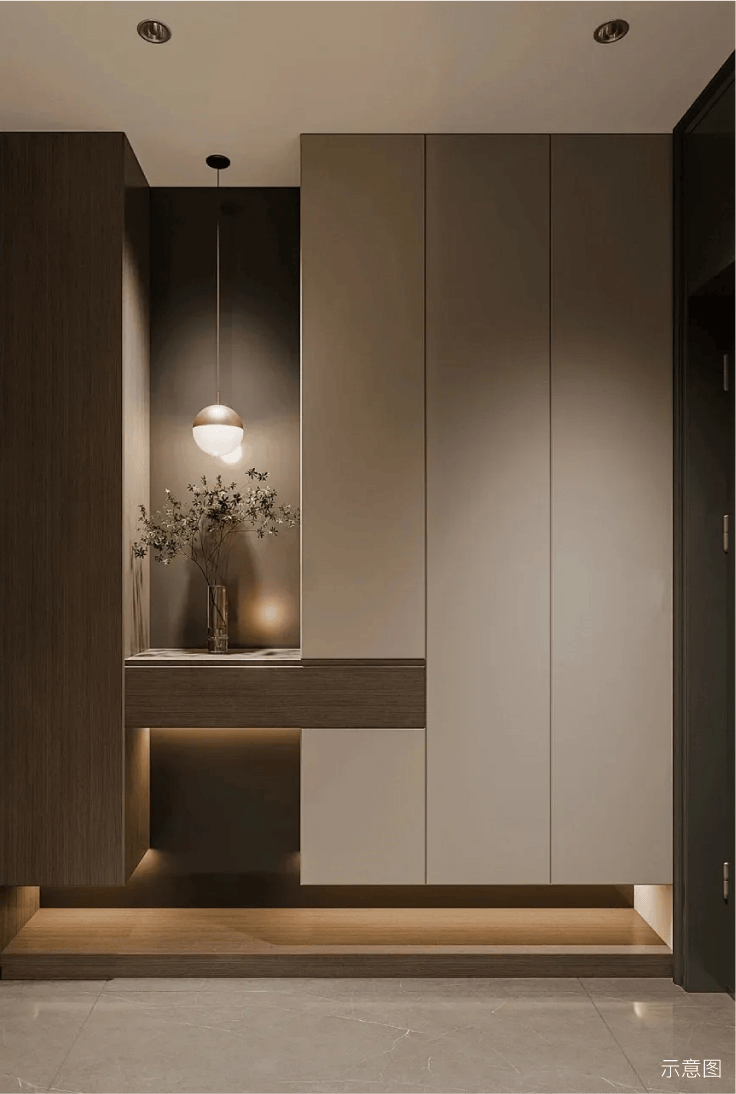 作为室内与户外之间的过渡缓冲空间,玄关对户外的视线产生了一定的视觉屏障。给家人稳稳的安全感和仪式感,让归家的每一步都渐入佳境。