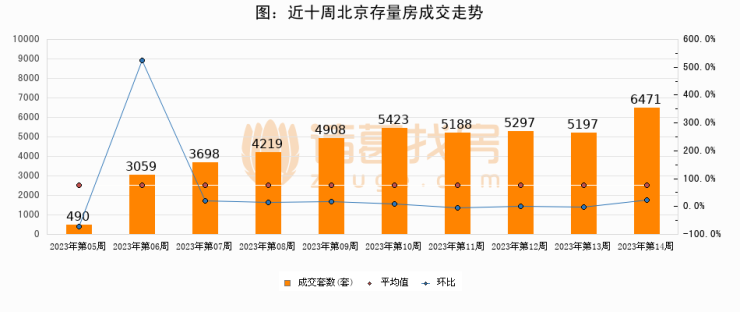 存量房方面,第14周北京存量房成交6471套,较上周增加1274套,环比上涨24.5%。从近十周成交走势来看,周均成交套数为4395套,本周高于平均水平47.2%。