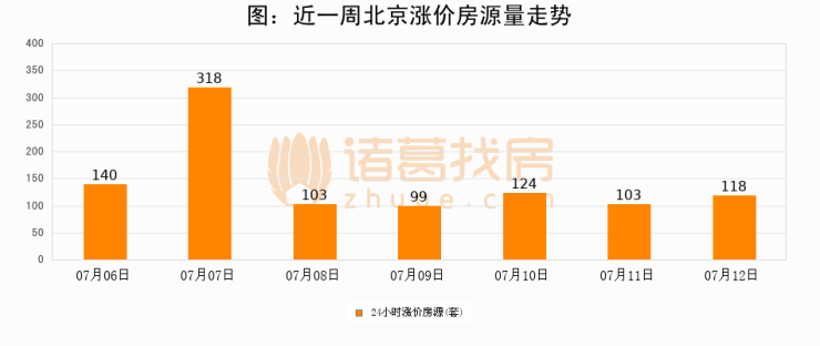根据诸葛找房数据显示,北京24小时涨价房源量为118套,较07月11日增加15套,环比上涨14.6%。与此同时,涨价房源占比小幅扩大,业主信心有所提升。