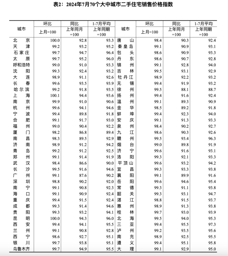 国家统计局数据显示,7月二手住宅房价环比上涨城市个数降至1个,2城环比持平,其余67城环比下跌。