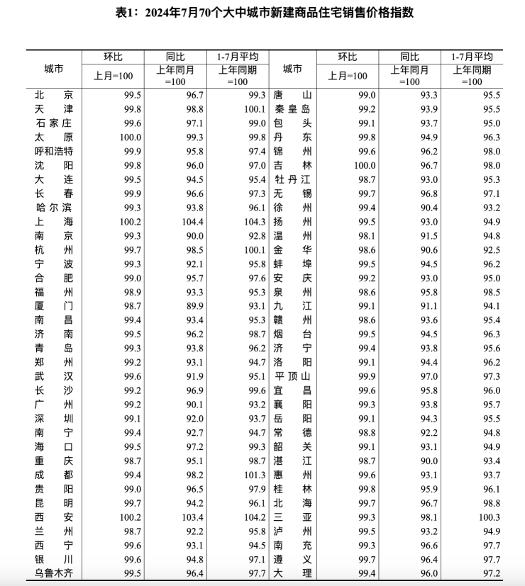 国家统计局数据显示,7月份,70个大中城市中,新建商品住宅房价环比上涨城市数量2个,较上月减少2城;2城环比持平;其余66城环比下跌,下跌城市个数占比约94%。