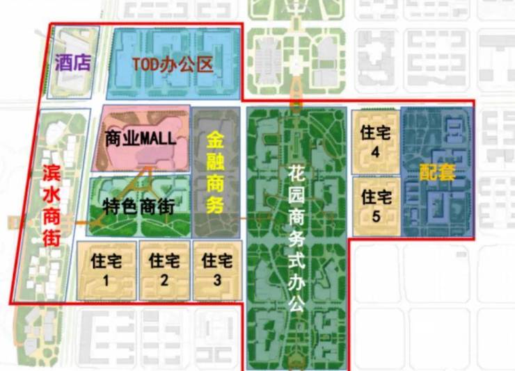 红色的区域中大家可以看到住宅和其他配套的比例,住宅少量,商业Mall、特色商街、滨河森林公园、金融商务等规划为主。
