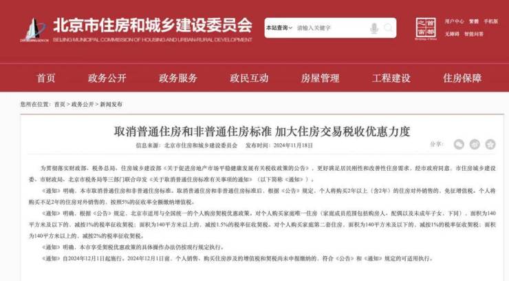 11月18日晚,北京市住建委、北京市财政局、北京市税务局等三部门联合印发《关于取消普通住房标准有关事项的通知》,取消普通住房和非普通住房标准。
