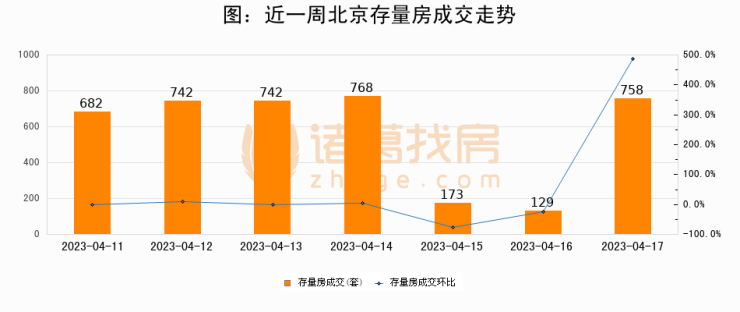 从存量房来看,2023年04月17日北京存量房单日成交758套,比昨日增加629套,环比上涨487.6%。从近一周存量房成交来看,北京存量房日均成交套数为570套,04月17日单日成交758套,高于近一周平均水平33%。
