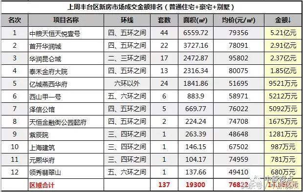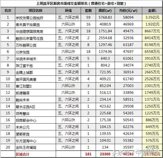 丰台区上周跃居成交市场排名前列,14.86亿元的总成交额,先进上周北京新房市场区域成交额排行榜首位,成交137套,套均价1085万元/套,中粮天恒天悦壹号、首开华润城、华润昆仑域等提供了大量货值。昌平、朝阳分列第二、第三位。昌平区上周成交161套,是上周成交套数较多的区域,成为上周新房市场销售套数冠军。