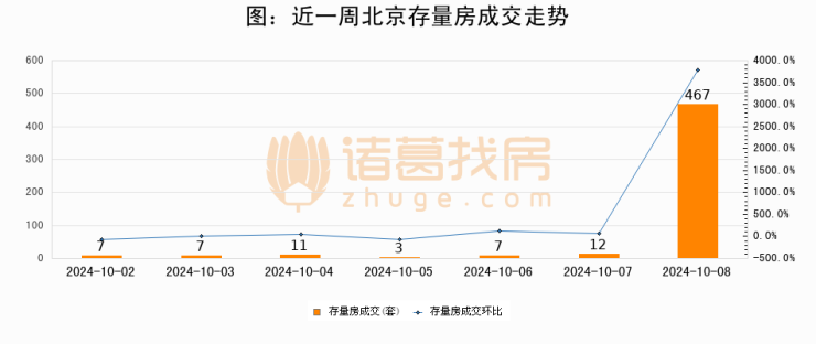 从存量房来看,2024年10月08日北京存量房单日成交467套,比昨日增加455套,环比上涨3791.7%。从近一周存量房成交来看,北京存量房日均成交套数为73套,10月08日单日成交467套,高于近一周平均水平539.7%。