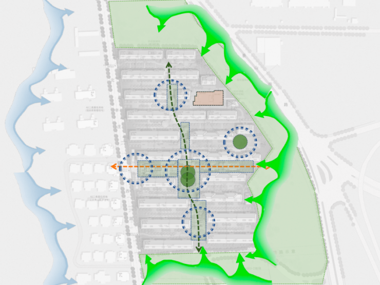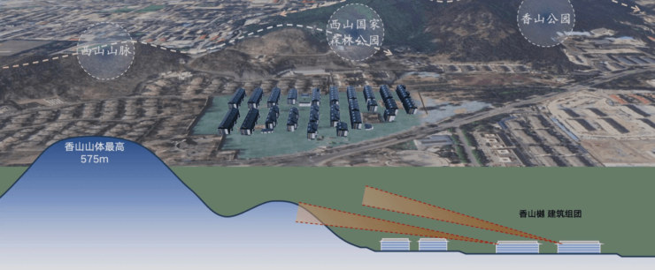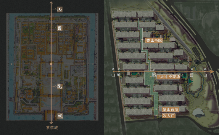 以社区归家两轴的横轴为例,西侧香山,门口为市政道路,进入园区则为核心景观节点,继续向东则为东侧市政公园,整体格律恰与故宫“城—院—园—山”的规制相合,尊贵感满满。