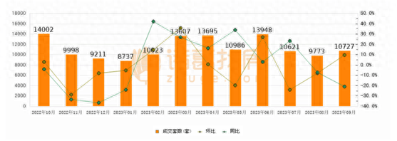 另据诸葛找房,9月北京新建商品房成交10727套,较8月增加954套,环比上涨9.8%,同比下降21%。