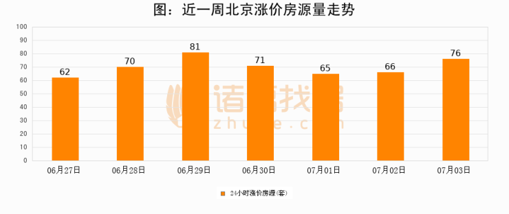 根据诸葛找房数据显示,北京24小时涨价房源量为76套,较07月02日增加10套,环比上涨15.2%。与此同时,涨价房源占比小幅扩大,业主信心有所提升。