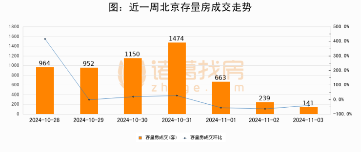 从存量房来看,2024年11月03日北京存量房单日成交141套,比昨日减少98套,环比下降41%。从近一周存量房成交来看,北京存量房日均成交套数为797套,11月03日单日成交141套,低于近一周平均水平82.3%。