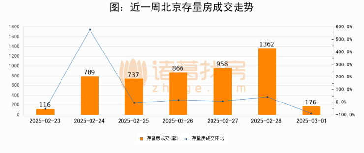 从存量房来看,2025年03月01日北京存量房单日成交176套,比昨日减少1186套,环比下降87.1%。从近一周存量房成交来看,北京存量房日均成交套数为714套,03月01日单日成交176套,低于近一周平均水平75.4%。