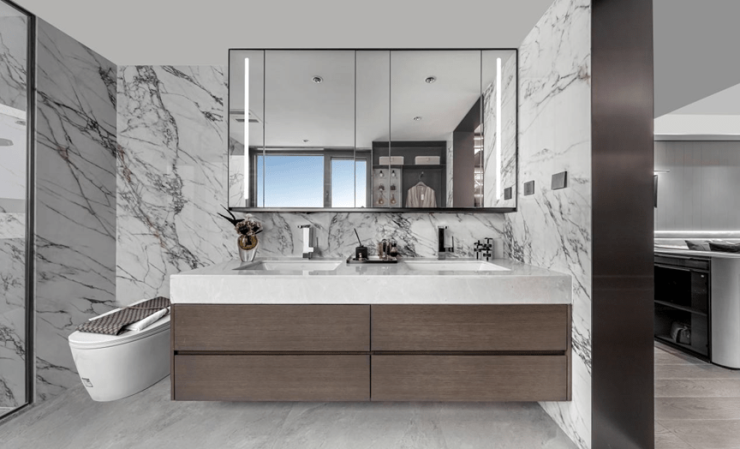 143㎡户型回应群贤的生活审美,在材质的选择上也是非常严苛,如入户门选用的铸铝门,细腻的纹理,低调奢华的气息呼之而出;餐客厨地面铺装的纯天然石材,运用万年的自然肌理,带来更有艺术韵味的空间情境。客厅的高定岩板背景墙,提炼山川的色彩与纹路,品质也无惧时间的打磨;主卧背景墙采用奢侈品级的皮革材质,彰显奢华质感,升维空间美学。
