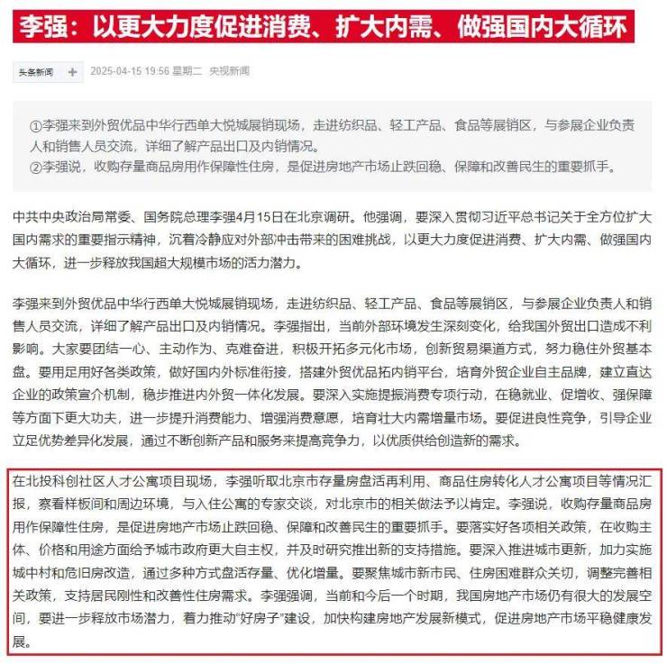 4月15日晚,楼市传来重磅消息:总理在北京调研时,对房地产行业做了一系列新的指示。