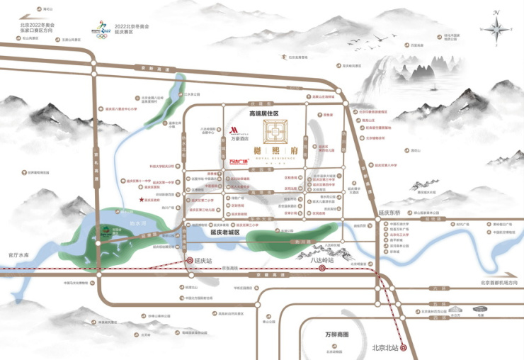 樾熙府虽然处于延庆,但是随着近期京张高铁的开通,让这里与城区的联系更为紧密,除此之外,从上方区位图可以看出,该区域内有京藏、京礼、京新三条高速,可以轻松抵达五环。