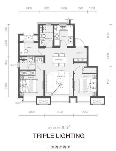 中海寰宇时代89平是它的主力户型,通过户型图我们看出,项目主卧、次卧及客厅三面朝南,总面宽达到了9.2米,采光不再是问题,该户型入口正对玄关,私密性强。在主卧处配备了一个独立卫生间,整个房间打造成两卫的设计,厨房U型设计,减少了空间的浪费。