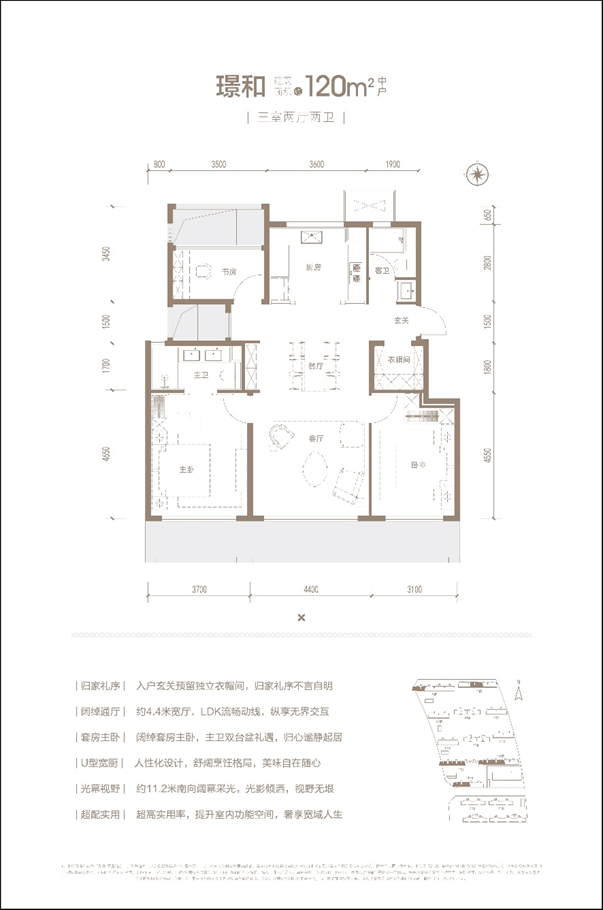 南向通体阳台,客厅面宽做到了4.4米,整体采光面长达11.2米,同等面积,这个尺寸,很有吸引力。