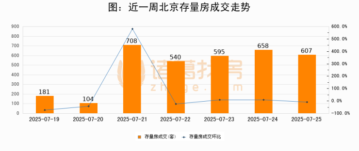 从存量房来看,2025年07月25日北京存量房单日成交607套,比昨日减少51套,环比下降7.8%。从近一周存量房成交来看,北京存量房日均成交套数为484套,07月25日单日成交607套,高于近一周平均水平25.4%。