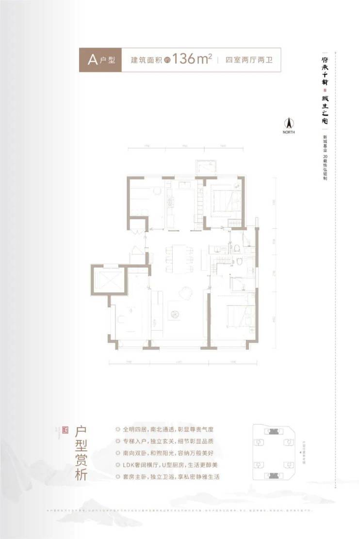 136平四室两厅两卫,南北通透,四叶草户型;宽厅面宽4.3米,主卧面宽3.5米,LDK一体设计,总价大概在843万。
