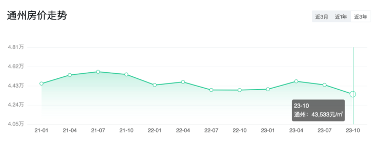 在17年3·17之后,通州房价再也没站起来过,多数板块处于阴跌状态。二手房挂牌均价在4.3万/平米左右。